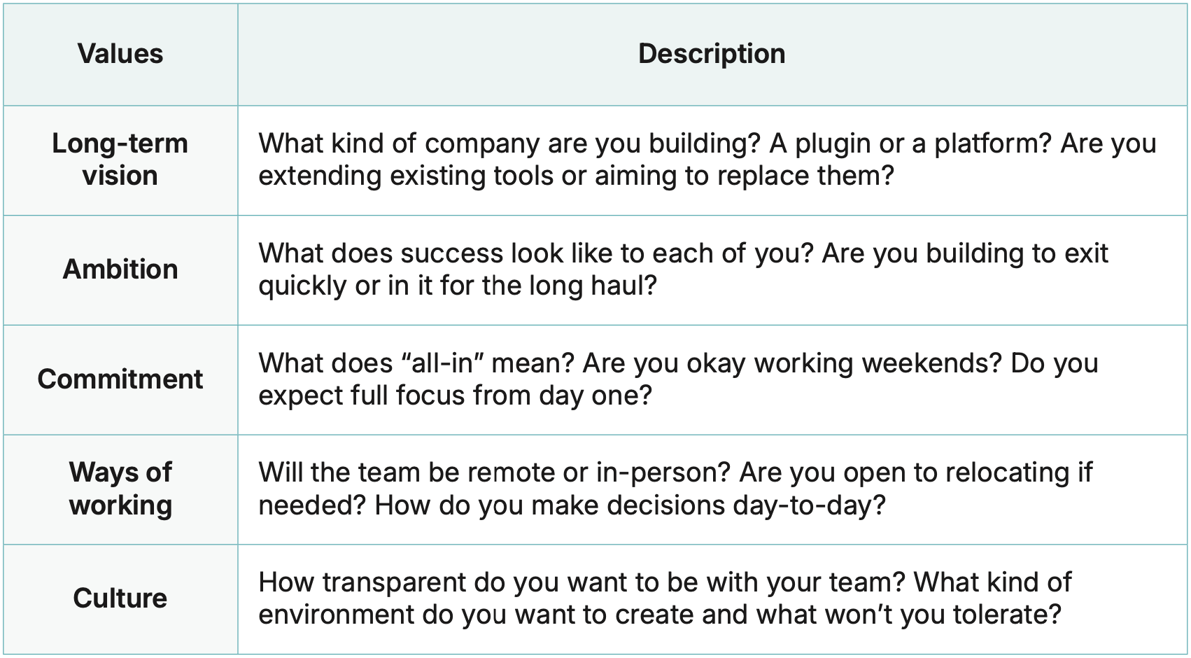 That’s why great founding teams treat value alignment as a recurring practice. They revisit the five non-negotiables — ambition, vision, commitment, ways of working, and cultural values — regularly, especially during key inflection points: fundraising, hiring, pivots, or even personal life changes.