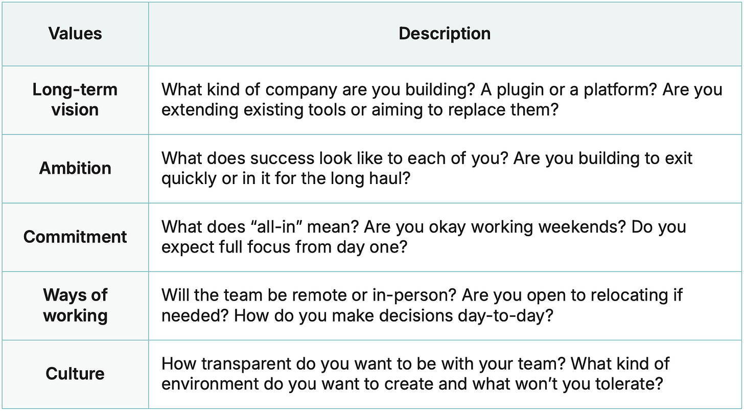 Because you’re not just starting a product together, you’re building a business, a culture, and a long-term partnership. If you’re misaligned on the fundamentals, it will be hard to get through it.