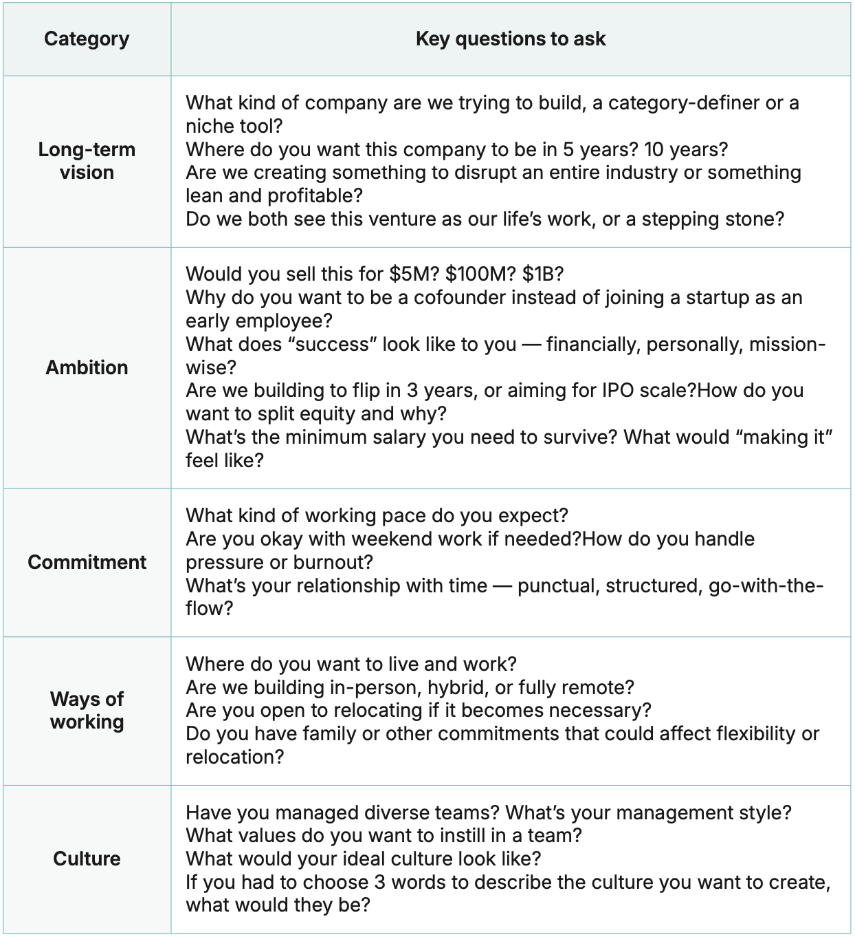 There are plenty of great cofounder questionnaires out there and they’re all useful. But instead of listing every possible question, let’s zoom in on what actually matters most when assessing a potential cofounder.