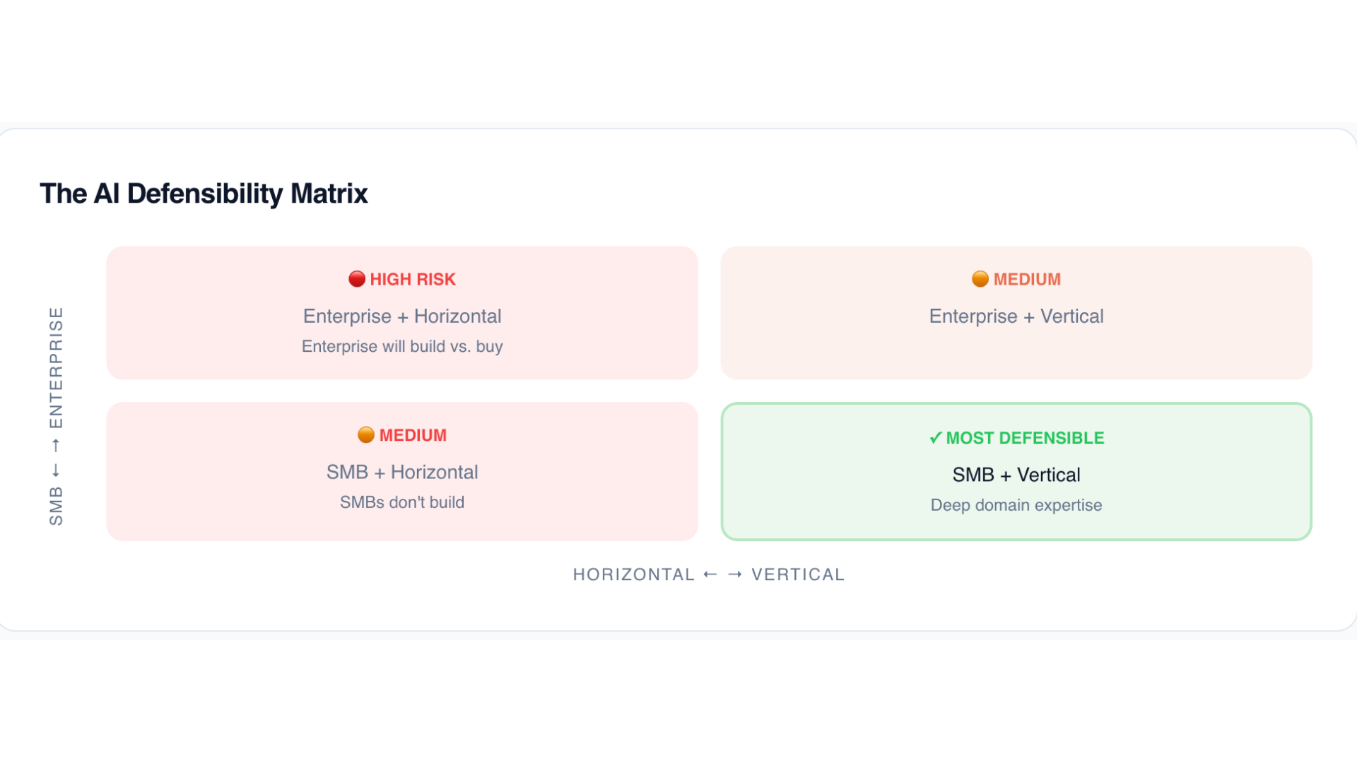 This is different from the enterprise customers that horizontal SaaS serves. Large companies have engineering teams that can evaluate build-versus-buy decisions. When AI makes it easier to build custom internal tools, those companies will increasingly choose to build. But your customers—the restaurant owner, the dental practice manager, the hotel operator—they just want a tool that works. They will buy, not build.
